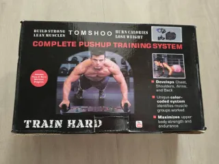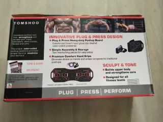 Sistema completo per allenamento push-up Tomshoo. - Sviluppa petto, spalle, braccia e schiena. - Sistema unico color-coded che identifica i gruppi muscolari. - Massimizza la forza e la resistenza della parte superiore del corpo. - Include programma di allenamento Tone & Burn.