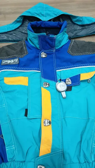 Giacca da sci Mam con cappuccio staccabile. - Colori vivaci: blu, turchese e giallo. - Dettagli a contrasto grigi sulle spalle. - Chiusura frontale con bottoni a pressione. - Tasche frontali con patta e bottone. - Polsini elasticizzati.