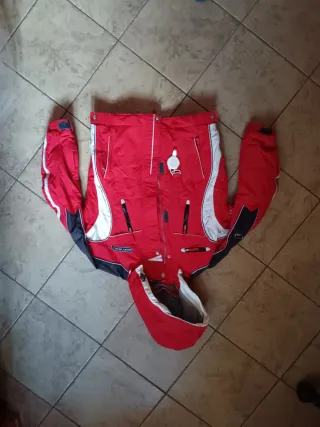 Tuta da sci per bambino o bambina West Scout, perfetta per le giornate sulla neve. - Giacca rossa con inserti bianchi. - Pantaloni rossi con inserti bianchi Unici difetti I segni di scritta sulla giacca e le cerniere rotte