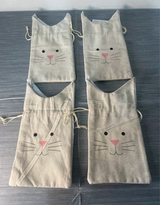 Set di 4 sacchetti regalo a tema Pasqua, con un simpatico design a forma di gatto. - Realizzati in tessuto color crema. - Dettagli ricamati per viso e baffi. - Chiusura con cordoncino.