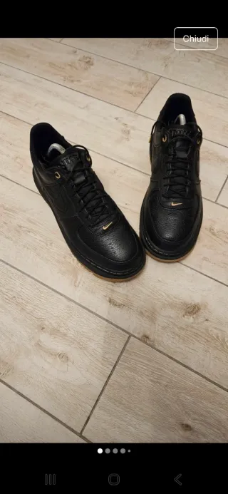Scarpe Nike Air Force 1 nere. - Tomaia in pelle. - Dettagli dorati. - Suola in gomma.