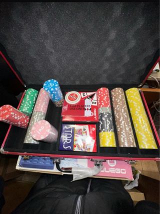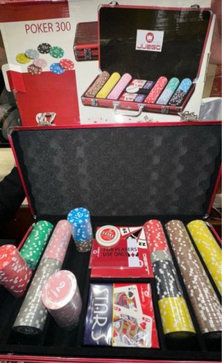 Set completo de fichas de póker marca Juego. - 300 fichas de póker. - Incluye estuche. - Fichas de diferentes colores y valores.