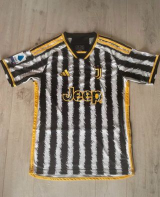 Maglia ufficiale della Juventus per la stagione 2023/24, indossata da Chiesa. - Design a strisce bianche e nere. - Dettagli dorati sulle maniche e sui lati. - Logo Adidas e stemma Juventus. - Sponsor Jeep sul petto.