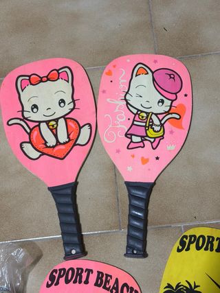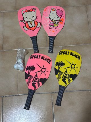 Set di 4 racchette da spiaggia, perfette per divertirsi all'aperto. Include anche delle palline. - Due racchette rosa con disegni di gattini. - Due racchette colorate (rosa e gialla) con tema Sport Beach e paesaggio tropicale. - Manici neri antiscivolo.