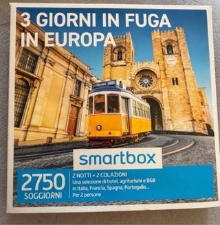 Smartbox 3 Giorni in Fuga in Europa per 2 persone. SENZA PELLICOLA. - Include 2 notti e 2 colazioni. - Offre una selezione di hotel, agriturismi e B&B. - Valido per soggiorni in Italia, Francia, Spagna e Portogallo.