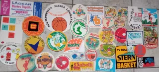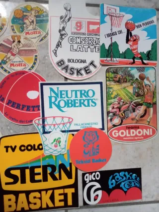 Lotto di adesivi a tema basket, molti con riferimenti a squadre e manifestazioni italiane. - Adesivi di varie forme e dimensioni. - Grafiche vintage e moderne. - Marchi come LA Gear, Motta, Neutro Roberts e altri.