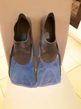 Pinne con pala corta, realizzate in 100% silicone, utilizzate principalmente x l'allenamento in piscina dei nuotatori, usate poco e in ottime condizioni, taglia 37/38, unisex.