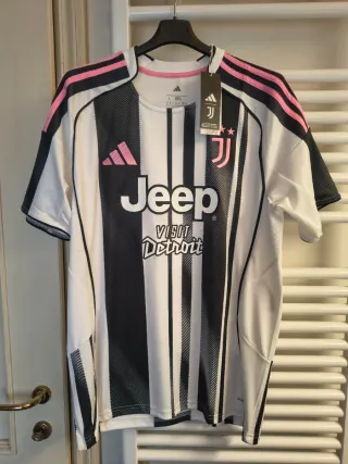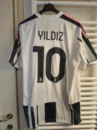 Maglia da calcio della Juventus, stagione 2025-2026, con il nome e numero di Yildiz. - Design a strisce bianche e nere. - Dettagli rosa sulle spalle e sul logo. - Sponsor Jeep. - Logo Adidas e stemma Juventus.