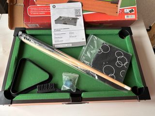 Biliardino da tavolo completo di accessori. - Biliardino con stecche. - Set di palline da biliardo. - Triangolo per la disposizione delle palline. - Cubetti di gesso.