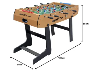Biliardino calcetto marca Match, modello Ripiegabile Salva Spazio. Facile da riporre quando non in uso. - Struttura in legno color naturale. - Gambe nere pieghevoli. - Campo da gioco verde. - Ometri rossi e blu. - Barre con manopole nere.