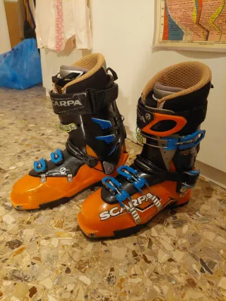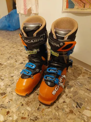 Scarponi da sci Rossignol Pure Pro 80 con fodera interna in pelliccia sintetica grigia e borsa arancione. - Borsa da sci arancione con logo. - Chiusure a scatto. Sono un 25,5 ma vanno bene anche per una persona che porta un 37 Circonferenza polpaccio —> 38 cm