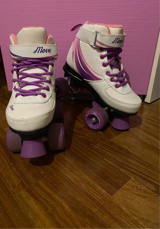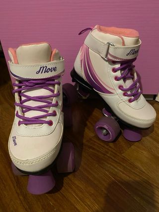 Pattini a rotelle per bambini, con un design moderno e colorato. - Colore principale bianco con dettagli viola e rosa. - Chiusura con lacci viola e velcro. - Ruote viola. non ho avuto tempo di pulirli prima della foto, ma prima della spedizione verrà fatta un’accurata pulizia!!!! trattabile