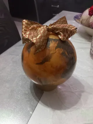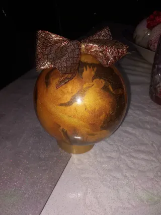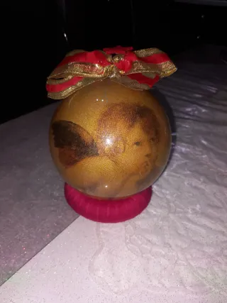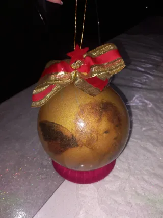 Bellissima palla di Natale decorata con la tecnica del decoupage. Un pezzo unico per addobbare il tuo albero. - Decorazione floreale e dorata. - Fiocco rosso e oro sulla parte superiore. - Base di supporto in velluto fucsia.