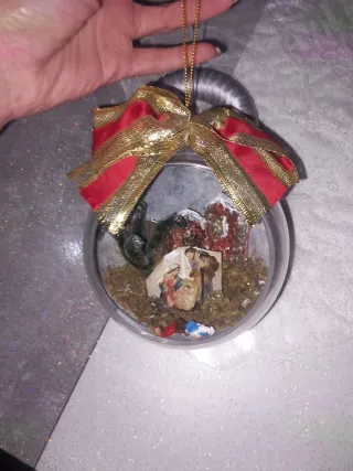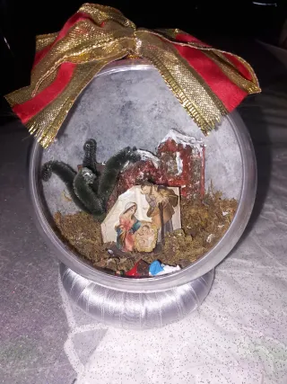 Deliziosa palla in plexiglass creata a mano, con una scena della Natività al suo interno. - Decorazione natalizia unica. - Base in tessuto argentato. - Fiocco rosso e oro in cima.