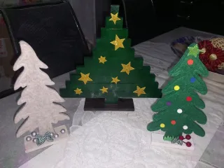 Set di tre alberelli decorativi fatti a mano, perfetti per aggiungere un tocco natalizio alla tua casa. - Alberello in feltro bianco con base in legno e decorazioni. - Alberello in legno verde a gradini con stelle dorate. - Alberello in feltro verde con palline colorate e base in legno.tutti € 7