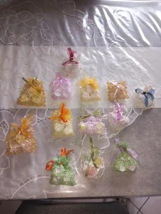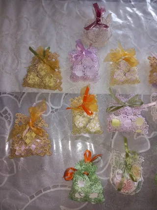 Deliziosi sacchetti profumati realizzati a mano, perfetti come bomboniere o piccoli pensieri. - Realizzati in pizzo e decorati con nastri colorati. - Contengono gessetti profumati.€ 1 ciascuno