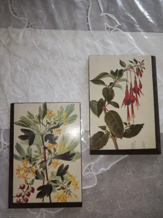 Set di due quadretti decorati con la tecnica del decoupage, raffiguranti illustrazioni botaniche. - Motivo floreale e fruttato. - Cornice scura.tutti € 8