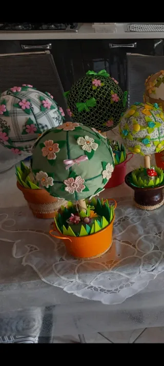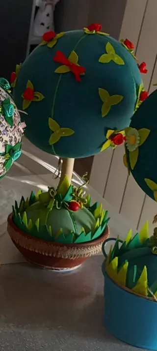 Deliziosi alberelli decorativi realizzati a mano con stoffa, perfetti per aggiungere un tocco di originalità alla tua casa. - Decorati con fiori in stoffa e nastrini. - Base in vaso arancione con erba sintetica. - Un piccolo funghetto rosso decora uno degli alberelli.€ 5 ciascuno