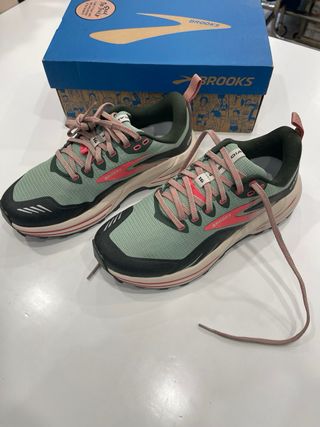 Scarpe da running Brooks da donna, ideali per trail running. Colore verde acqua con dettagli rosa. - Tomaia in mesh traspirante. - Suola ammortizzata. - Lacci rosa. - Logo Brooks sui lati. misura 37.5