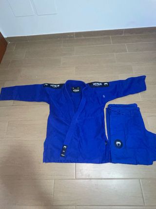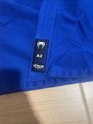 Ghee Venum per sport da combattimento, taglia A2. Il ghee è di colore blu. - Logo Venum sulle maniche e sui pantaloni. - Etichetta con taglia A2 sul gi.