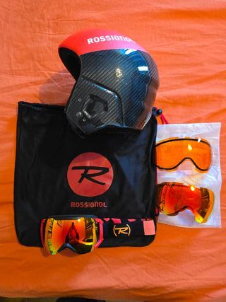 Casco e maschera da sci originali Rossignol. Il casco è il modello Hero Carbon Fiber omologato FISI, misura 61cm, di colore rosso e nero carbonio. Predisposizione per attacco mentoniera. In ottimo stato. Maschera modello Maverick HP Sonar Blaze con una lente specchiata color arancio per il sole NUOVA, una lente per il tempo nuvoloso in ottimo stato senza graffi e una ulteriore lente di ricambio specchiata arancione con qualche graffio ma comunque utilizzabile senza problemi. Inclusi sacca porta casco e sacchetto per lenti di ricambio.