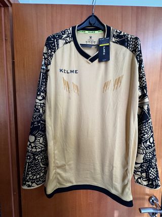 Maglia da portiere Kelme a manica lunga, ideale per il calcio. Presenta un design unico con dettagli grafici sulle maniche taglia XL. - Colore principale: oro. - Maniche lunghe con stampa. - Logo Kelme sul petto.