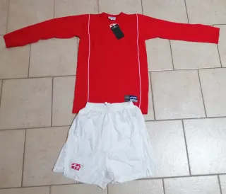 Completo da calcio composto da maglia a maniche lunghe e pantaloncini. - Maglia rossa con dettagli bianchi. - Pantaloncini bianchi con logo. - Taglia L, adatta per ragazzi di 13/14 anni.