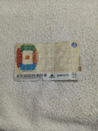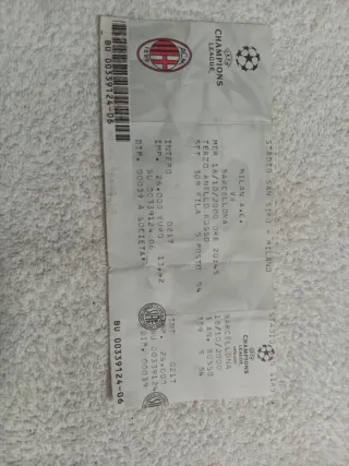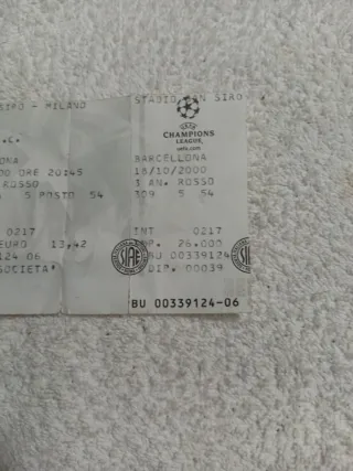Biglietto per la partita di Champions League tra Milan A.C. e Barcellona. - Data: 18/10/2000 - Stadio: San Siro, Milano - Settore: Terzo Anello Rosso - Fila: 309 - Posto: 54 - Prezzo: 26.000 Euro