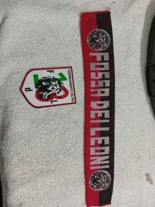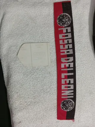 Telo e adesivo del gruppo Fossa dei Leoni. - Telo con scritta FOSSA DEI LEONI e disegno. - Adesivo a forma di scudo con leone e scritta TESSERAMENTO 93/94.