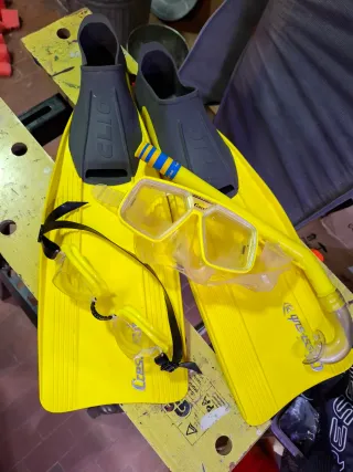 Set per immersioni composto da pinne gialle e maschera. Numero 35 36 - Pinne con calzari neri. - Maschera con lenti trasparenti. - Tubo con banda blu e gialla. - occhialini