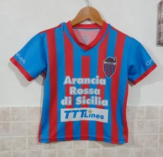 Maglia da calcio del Catania, con i colori iconici a strisce verticali rosse e blu. Presenta lo stemma del club e lo sponsor. - Design a strisce rosse e blu. - Stemma del Catania sul petto. - Sponsor Arancia Rossa di Sicilia e TTLines. Presenta scuciture