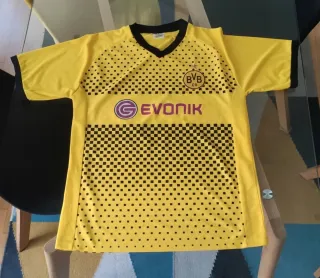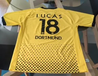 Maglia da calcio del Borussia Dortmund, colore giallo. - Logo BVB 09 sul petto. - Sponsor Evonik. - Design a scacchi nero su giallo. Maglia da calcio del Dortmund-Borussia, numero 18 Lucas calciatore paraguaiano che ha giocato con questa squadra dal 2009 al 2012. Taglia L. Colore giallo. In condizioni più che buone presenta solo una piccola macchia vicino al collo (evidenziata in foto).