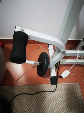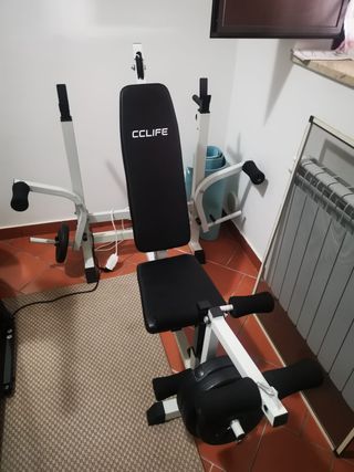 Panca multifunzione marca CC LIFE, ideale per allenamenti completi a casa. - Struttura robusta in metallo bianco. - Seduta e schienale imbottiti in ecopelle nera. - Dotata di supporti per esercizi con pesi e rulli per gambe.