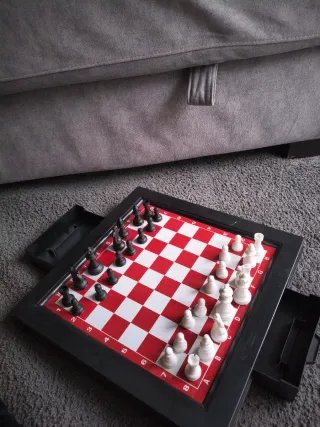 Scacchiera con design a scacchi rossi e bianchi, adatta sia per il gioco degli scacchi che per quello della dama. - Superficie di gioco 8x8. - Bordi numerati e con lettere per riferimento alle coordinate.