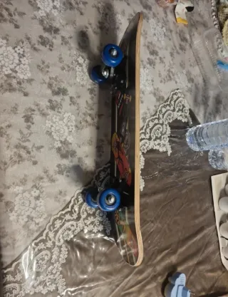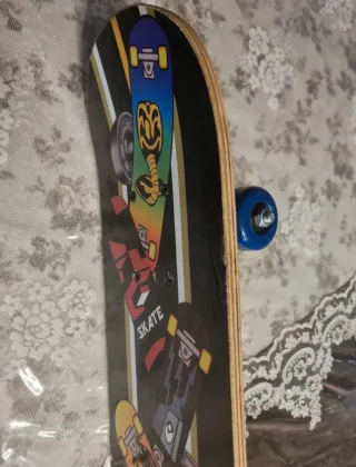 Skateboard con un design accattivante ispirato a Cobra Kai. Perfetto per gli appassionati. - Grafica colorata con il logo Cobra Kai. - Design a strisce nere e colorate. - Ruote blu. 60 cm