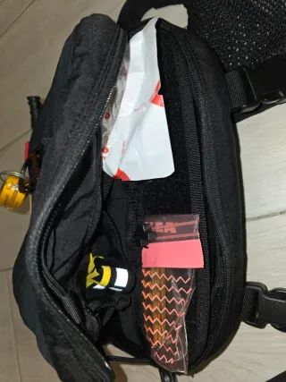 Cintura porta borraccia pensata per chi corre. Realizzata in tessuto nero, è comoda e funzionale. - Tasca porta borraccia integrata - N. 2 tasche porta documenti o chiavi - Cinturino regolabile con chiusura a clip. - Dettagli rossi e logo sul fronte.