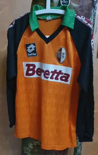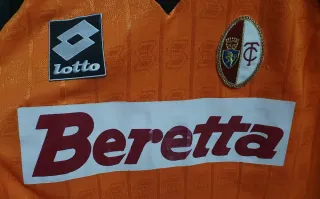 Maglia da calcio vintage del Torino, risalente agli anni '90. Un capo iconico per i tifosi. Taglia L - Sponsor Lotto. - Colore arancione con dettagli neri e verdi. - Logo del Torino applicato sul petto.