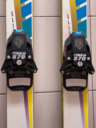 Set di sci vintage Fisher con bastoncini e attacchi Tyrolia abbinati. Perfetti per gli appassionati di sci retrò. - Sci marca Fisher. - Bastoncini da sci inclusi. - Design colorato e distintivo.