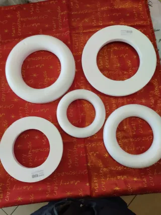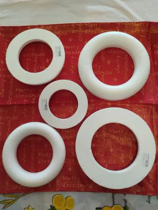 Set di 5 anelli in polistirolo, ideali per creare decorazioni personalizzate. - Materiale: polistirolo bianco. - Diverse misure per ogni esigenza creativa.