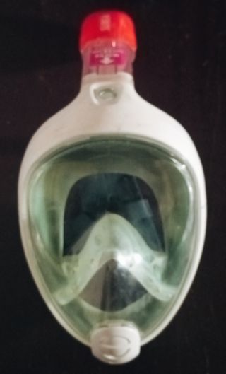 Maschera per fare snorkeling, con design integrale per una visione completa. - Colore bianco e trasparente. - Chiusura rossa sul tubo di respirazione.