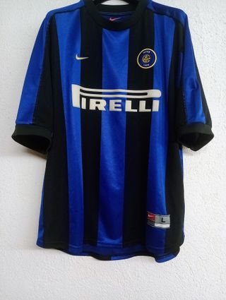 Maglia Nike Inter della stagione 1999/2000 di Ronaldo il fenomeno, presenta lo stemma del club ricamato sul lato cuore e il logo Nike a destra. Al centro, è posizionato lo sponsor commerciale Pirelli in bianco. Questa maglia rappresenta un simbolo di quegli anni in cui Ronaldo affascinò il mondo con la sua classe e potenza. Taglia L