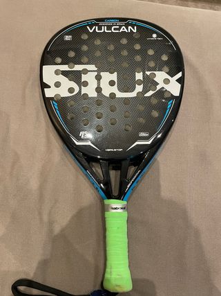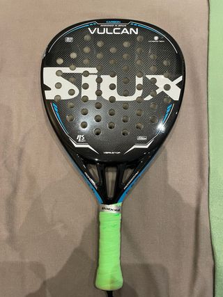 Racchetta da padel Stux Vulcan in carbonio. - Design moderno con finiture blu. - Superficie nera con texture. - Impugnatura verde. - Laccetto di sicurezza.