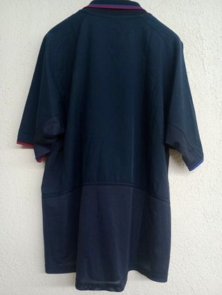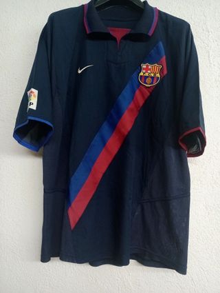 Maglia originale da trasferta Nike Barcelona 2002/2004, terza maglia, nei colori blu navy. Presenta colletto aperto con finiture rosso/blu. Stemma della squadra ricamato e logo del marchio in oro. Presenta 2 strisce diagonali rosse e blu sul davanti. Indossato da personaggi del calibro di Xavi, Andrés Iniesta, Carles Puyol, Patrick Kluivert, Luis Enrique e Marc Overmars. Taglia L