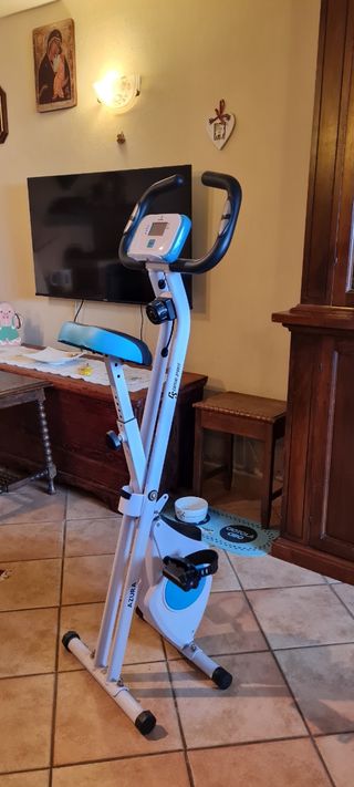 Cyclette da camera pieghevole, ideale per allenarsi in casa. - Struttura in metallo bianco e dettagli blu. - Sedile imbottito e schienale. - Manubrio con display. - Pedali con cinghie.