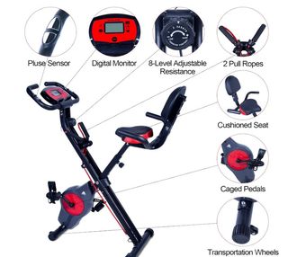 Cyclette pieghevole con display LCD e sedile regolabile. - Sensore per il battito cardiaco. - Monitor digitale. - 8 livelli di resistenza regolabile. - 2 corde per allenamento aggiuntivo. - Sedile imbottito. - Pedali con gabbia. - Ruote per il trasporto.
