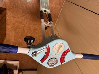 Cyclette Carnielli Dual, un pezzo vintage degli anni '70/'80. Ideale per allenamenti a casa. - Design retrò con finiture blu e bianche. - Manubrio cromato con impugnature nere. - Sella nera in similpelle. - Pedali neri. - Display con indicatori.