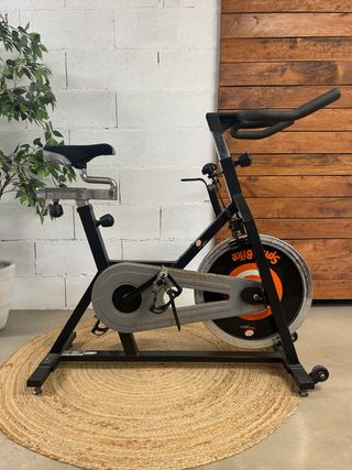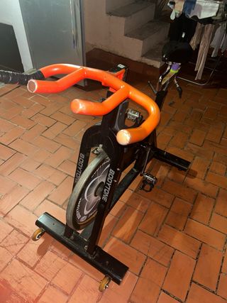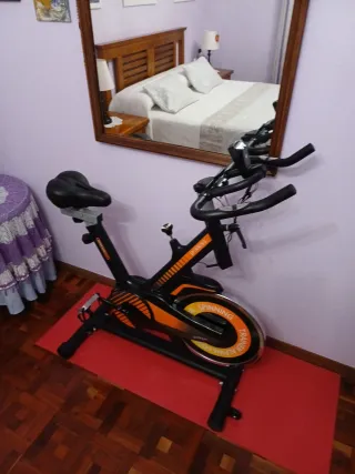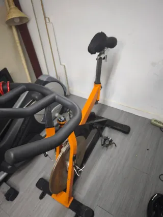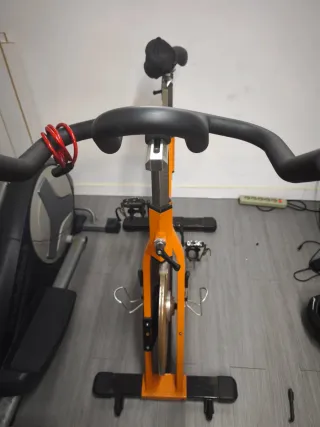 Bicicletta da spinning in perfette condizioni, pronta per i tuoi allenamenti a casa. Il suo design color arancione le conferisce un tocco moderno. - Manubrio regolabile. - Sella ergonomica. - Pedali con presa. - Volano d'inerzia. - Base stabile.