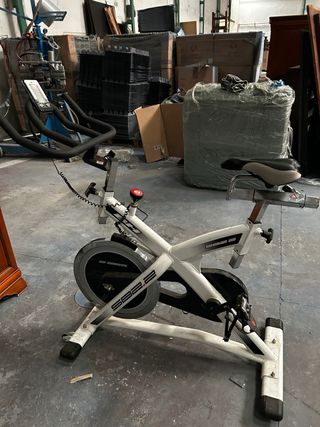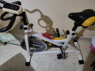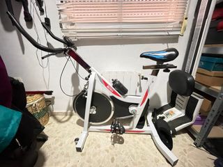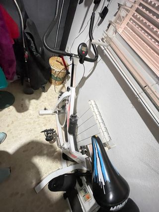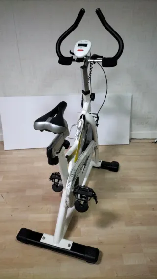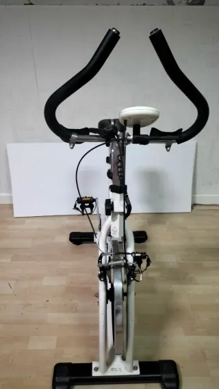 Bicicletta statica per allenamento di spinning a casa. Il suo design è moderno e funzionale. Usata 4 volte, non ha nemmeno un'ora di utilizzo. Struttura robusta di colore bianco. Sedile regolabile in altezza e posizione. Manubrio ergonomico. Ruota d'inerzia per resistenza. Pedali con presa. Supporto per bottiglia d'acqua. ATTENZIONE: NON CAMBIA