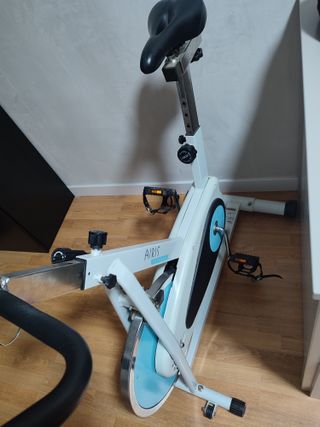 Bicicletta da spinning Airis Fitness in bianco con dettagli in blu. Design moderno e compatto. Sella regolabile. Pedali con presa. Nuova, non utilizzata.
