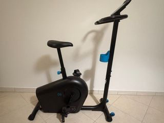 Bicicletta statica acquistata da Decathlon. Ideale per gli allenamenti a casa. - Design compatto. - Regolazione della resistenza. Non include l'adattatore elettrico, da acquistare separatamente.